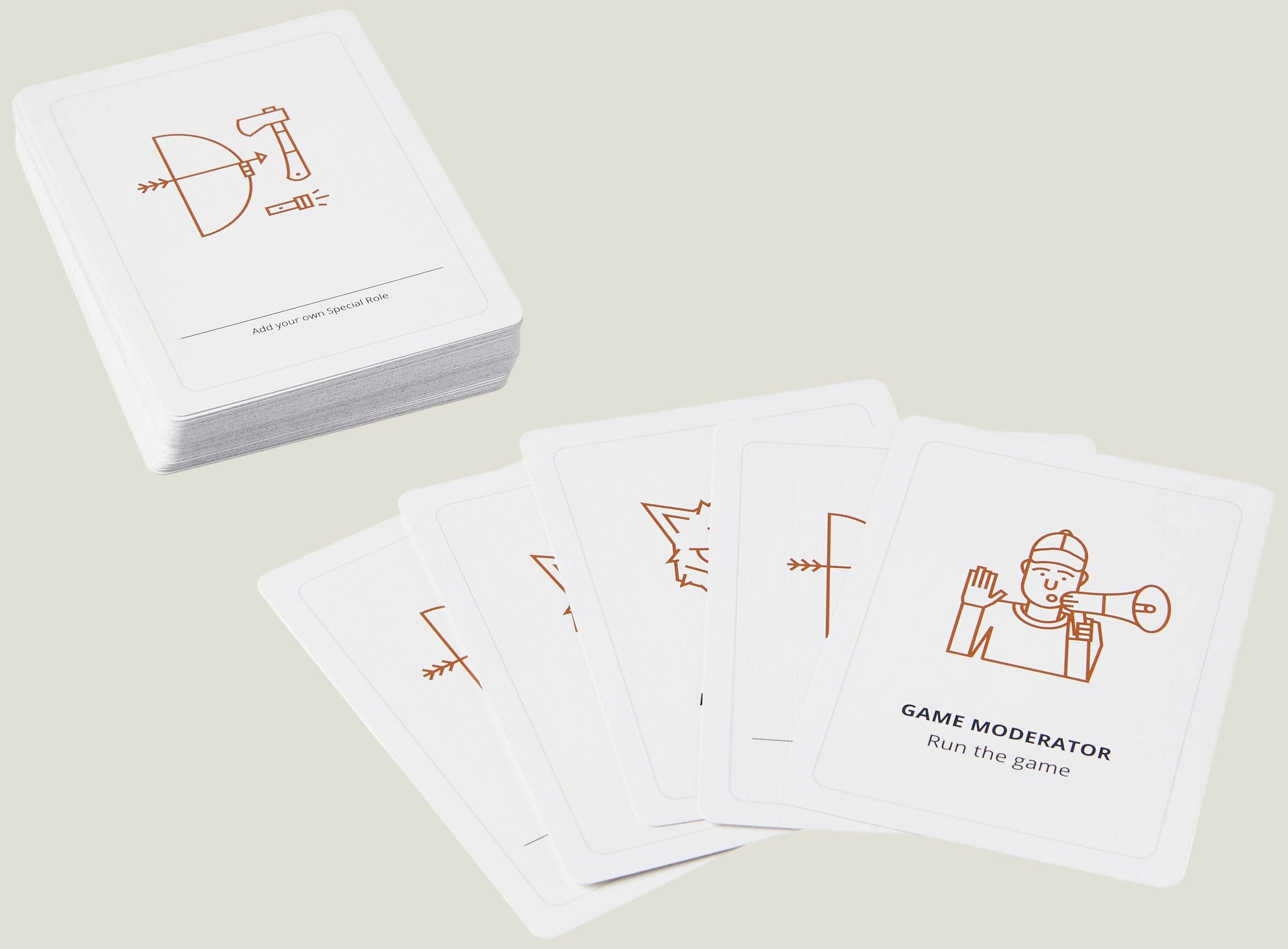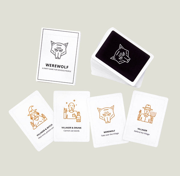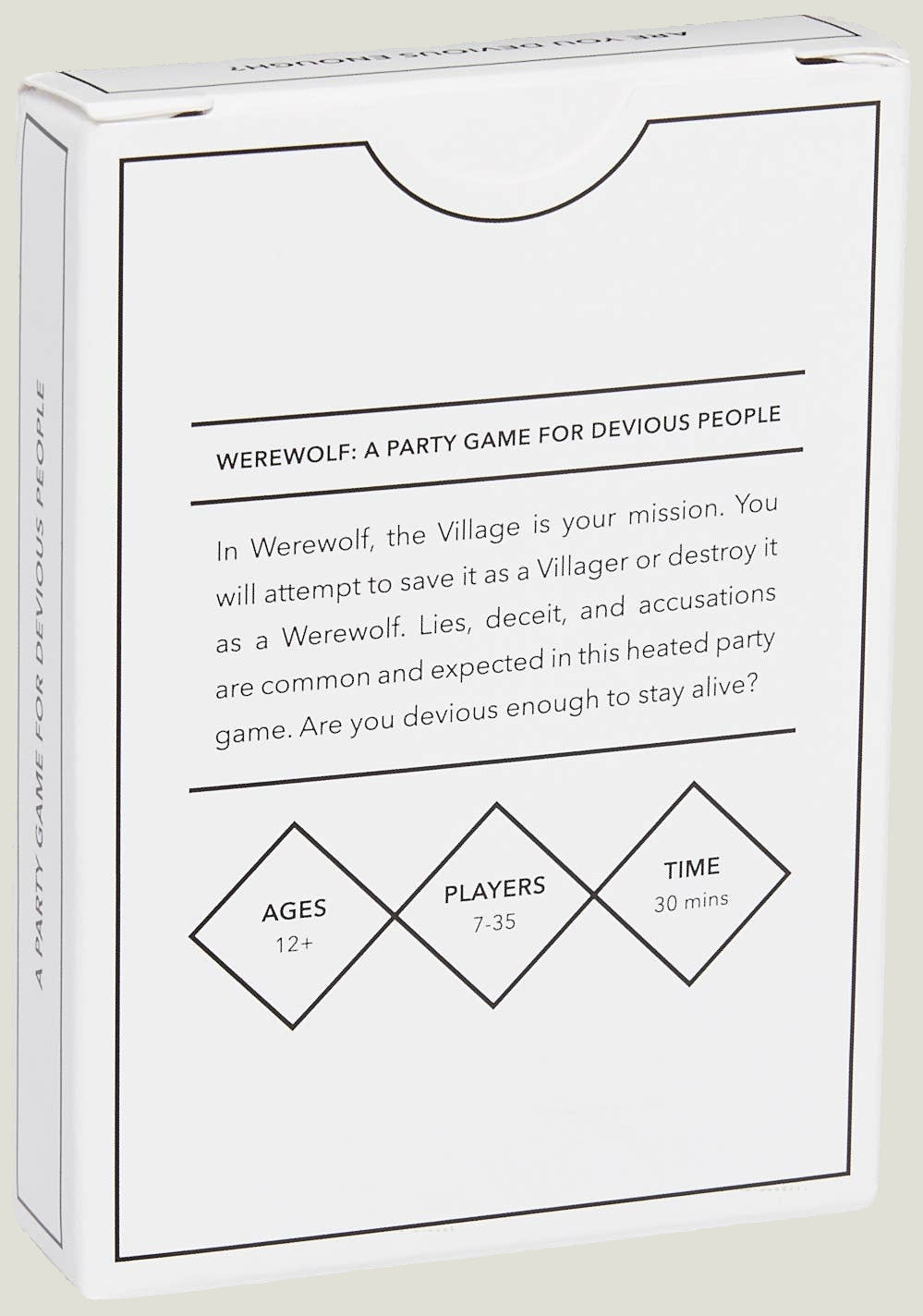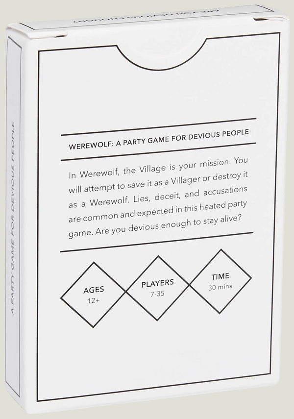 Our Werewolf deck comes with over 50 cards, allowing up to 35 people to play (enough for two simultaneous games as well)! The cards are made of casino-quality paper with a black core to avoid any see-through detection. It also includes special characters like the Village Drunk, Alpha Werewolf, Witch, and Wild Cards so you can create your own roles.