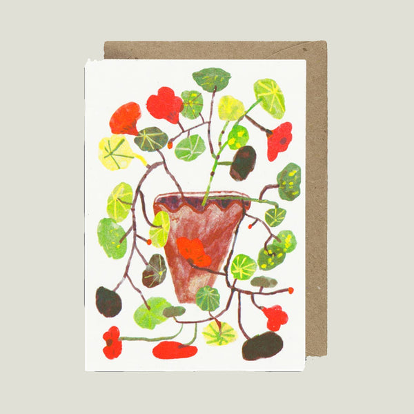 This Nasturtium card is perfect for many different occasions. The printing process means each card will vary slightly, which is part of the magic of riso-printing. This A6 card comes with a recycled brown envelope with a biodegradable cello. Blank inside. Illustrated by Rachel Cannings.