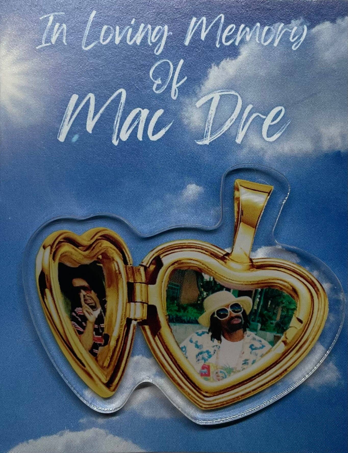 Item Description: An acrylic pin heart locket with pictures of Mac Dre with gold butterfly clasps. 2.5 inches x 2 inches