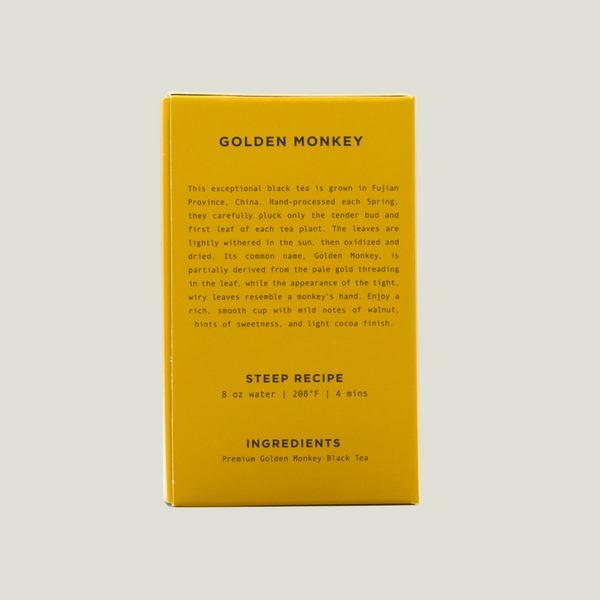 Named for the pale gold threading that runs through the leaves — and their tight, wiry shape resembling a monkey’s hand — Golden Monkey brews a rich, smooth cup with gentle complexity.