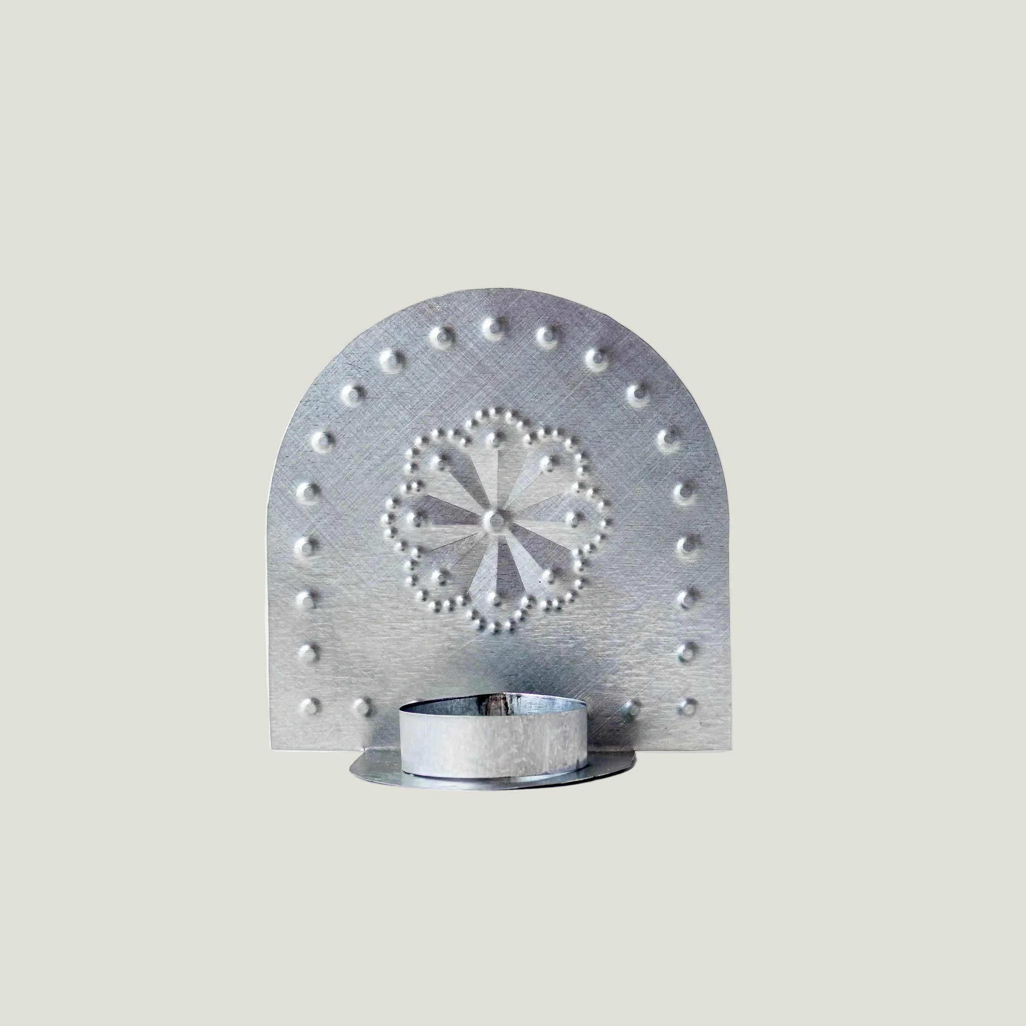 Handcrafted from polished tin using traditional hojalata techniques, the Roseta Tealight Holder features a single floral roseta motif hand-punched into an arched backplate. Designed for wall display, the luminous tin reflects the candle’s glow, bringing warmth and subtle texture to modern and traditional spaces alike. Holds a standard clear-cup tealight candle (sold separately).