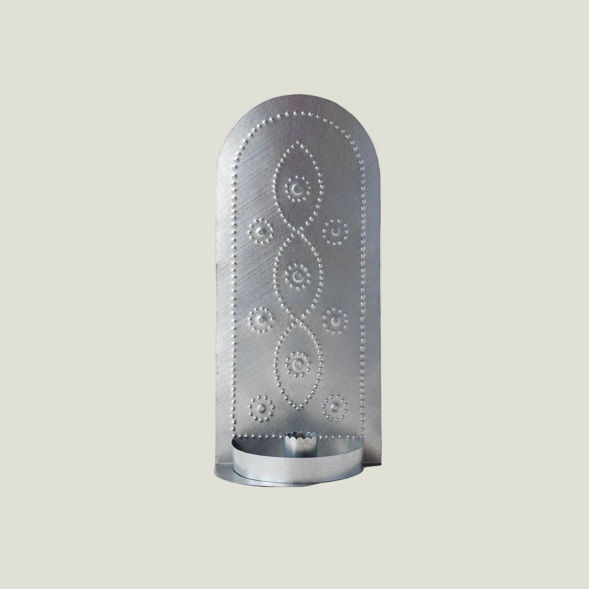 Handcrafted from polished tin using traditional hojalata techniques, the Vine Taper Holder features a hand-punched vine and floral motif on a tall arched backplate. Designed for wall display, the luminous tin reflects the candle’s glow, bringing warmth and subtle movement to modern and traditional spaces alike. Two discreet tabs on the back allow for easy hanging with wire.