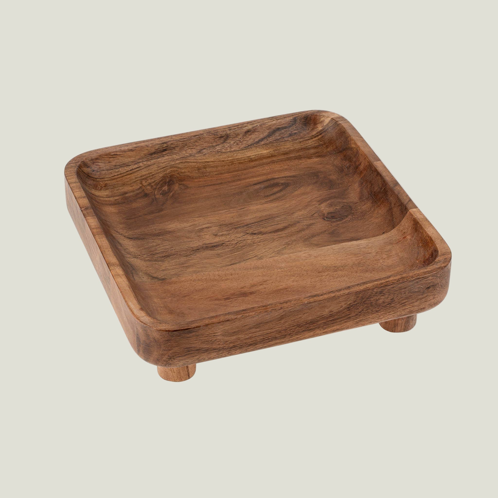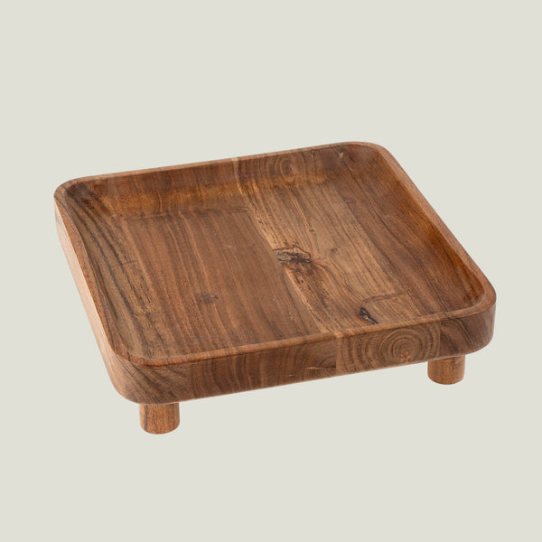 Felix Footed Tray: A Versatile Elevated Accent The Small Felix Footed Tray is a beautifully crafted piece made from sustainably sourced acacia wood. Designed to add height and dimension, this footed tray is perfect for serving food, displaying candles, or showcasing decorative accents. Its natural grain and warm tones bring an organic charm to dining tables, kitchen counters, or styled shelves, making it a functional yet stylish addition to any space.