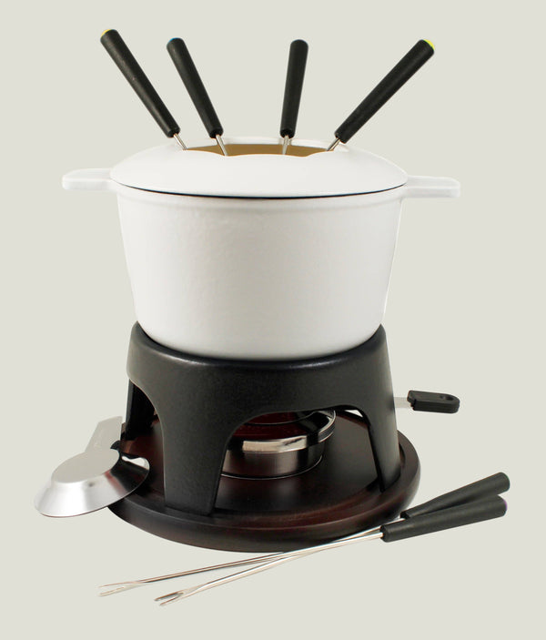 - Easy to clean Set Includes * cast iron fondue pot * Removable splatter guard * Rechaud * Fondue burner * Wood base - dark brown finish * 6 - 9½“ (24cm) forks – color coded