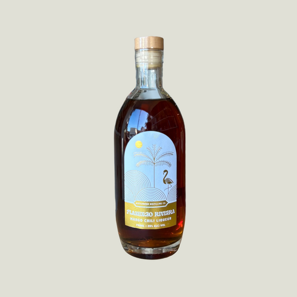 If you've spent any time in Mexico, you're familiar with Tajin - undeniably a cultural icon of Mexico. Tajín seasoning is often used to sprinkle over fresh fruits like mango, watermelon, and pineapple, as well as on vegetables, meats, snacks, and beverages. The spiciness of the chili peppers, the tanginess of the lime, and the saltiness come together to create a vibrant and zesty flavor profile that enhances the natural taste of the ingredients it's paired with. Flamingo Riviera uses arbol, ancho, guajillo and pasilla chilis to create a version of the Tajin spice blend -- adding the whole, dried chilis to the mango maceration. It sat for several months before straining and was proofed with a syrup made with those same chilis.