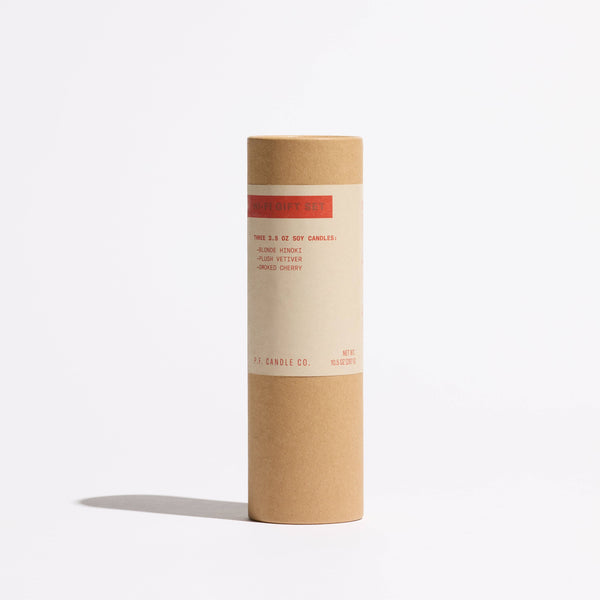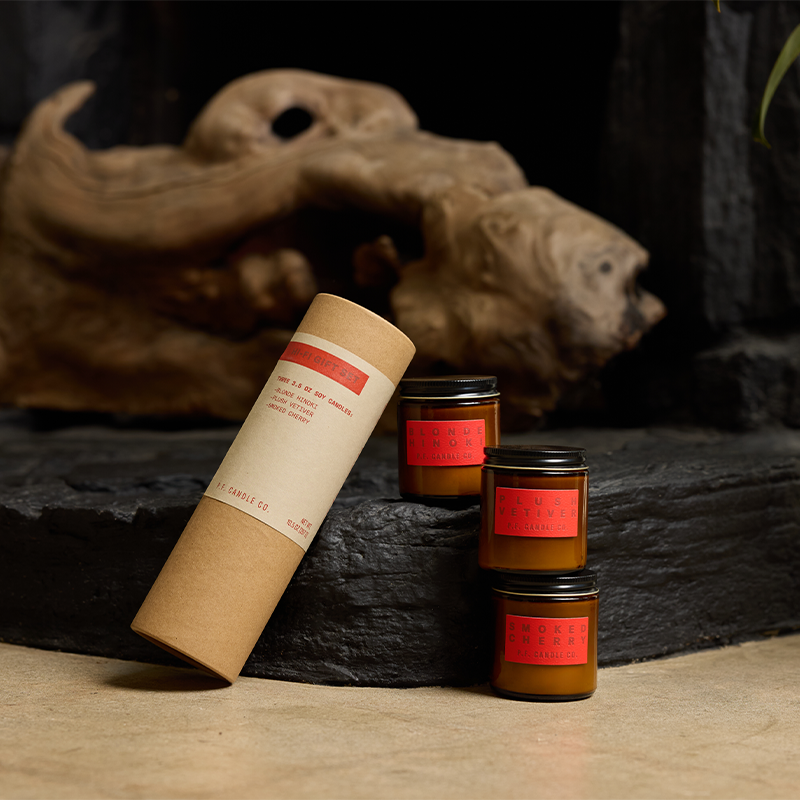 A premium line inspired by fine fragrance perfumery. Includes three 3.5 oz mini candles in Blonde Hinoki, Plush Vetiver, and Smoked Cherry.
