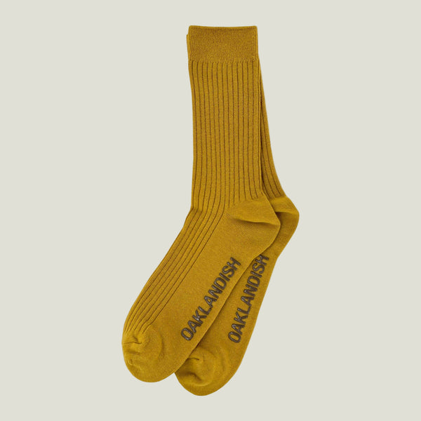 Mustard: Oaklandish raised gripping lettering on sole of sock