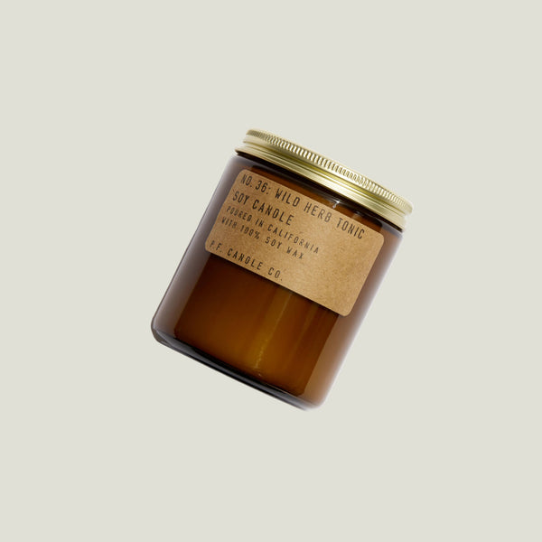 Barefoot walks through wild herb gardens, cool mountain stream baths, crisp morning air. Lemon balm, crushed thyme, orange rind, and fir. This candle is meant for dressers, countertops, nightstands – basically everywhere. All 7.2 oz Standard Candles are hand-poured into apothecary inspired amber jars with a  signature kraft label and a brass lid. These candles are simple - they're all made with 100% domestically grown soy wax, fine fragrance oils, and cotton-core wicks. The fragrances used are paraben-free, phthalate-free, and never (ever) tested on animals. Burns for 40-50 hours.