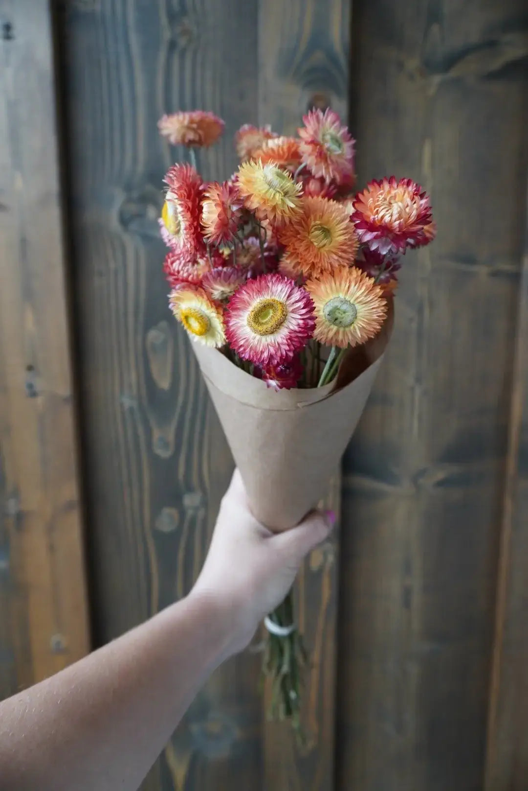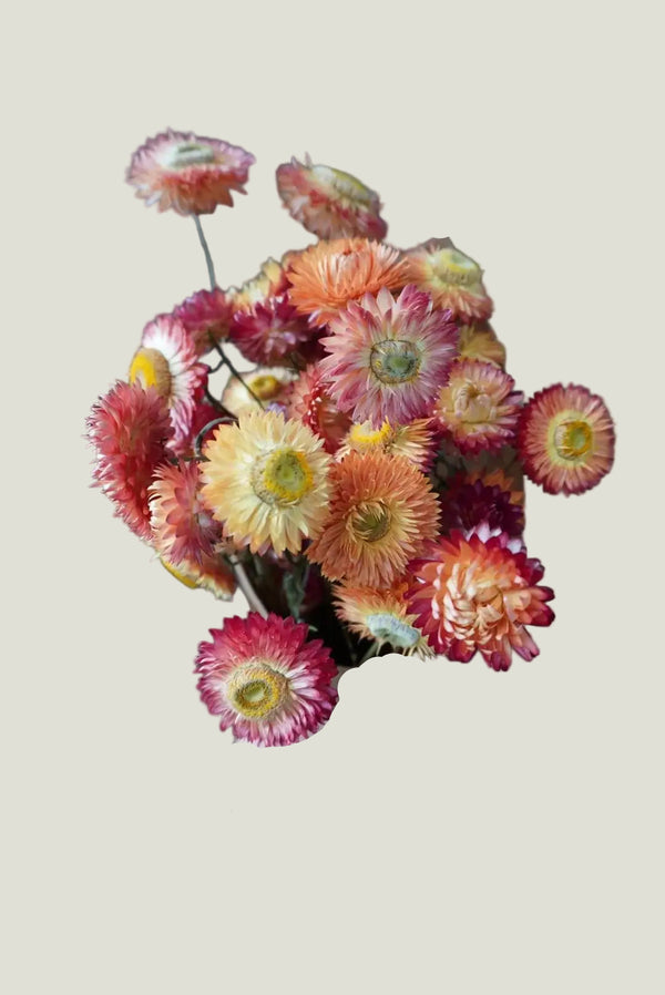These strawflowers were organically and sustainably grown on oa farm and naturally hang dried without the use of any chemicals or dyes. They are beautiful enough to stand alone in a vase, hung up on the wall, or used for crafting. Bunches consist of 10-15 stems with blooms ranging from 0.5" to 2". The length of the stems are between 12"-16". The colors and size of flowers may vary. Dried flowers are fragile so some minimal breaking may occur during the shipping process. Dried flowers will last several years with the proper care - keep out of water, humidity and direct sunlight for the best results. If the flowers droop due to rehydration, simply hang upside down for a couple days in a dry area to regain straight stems.