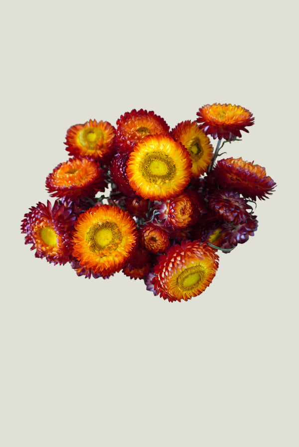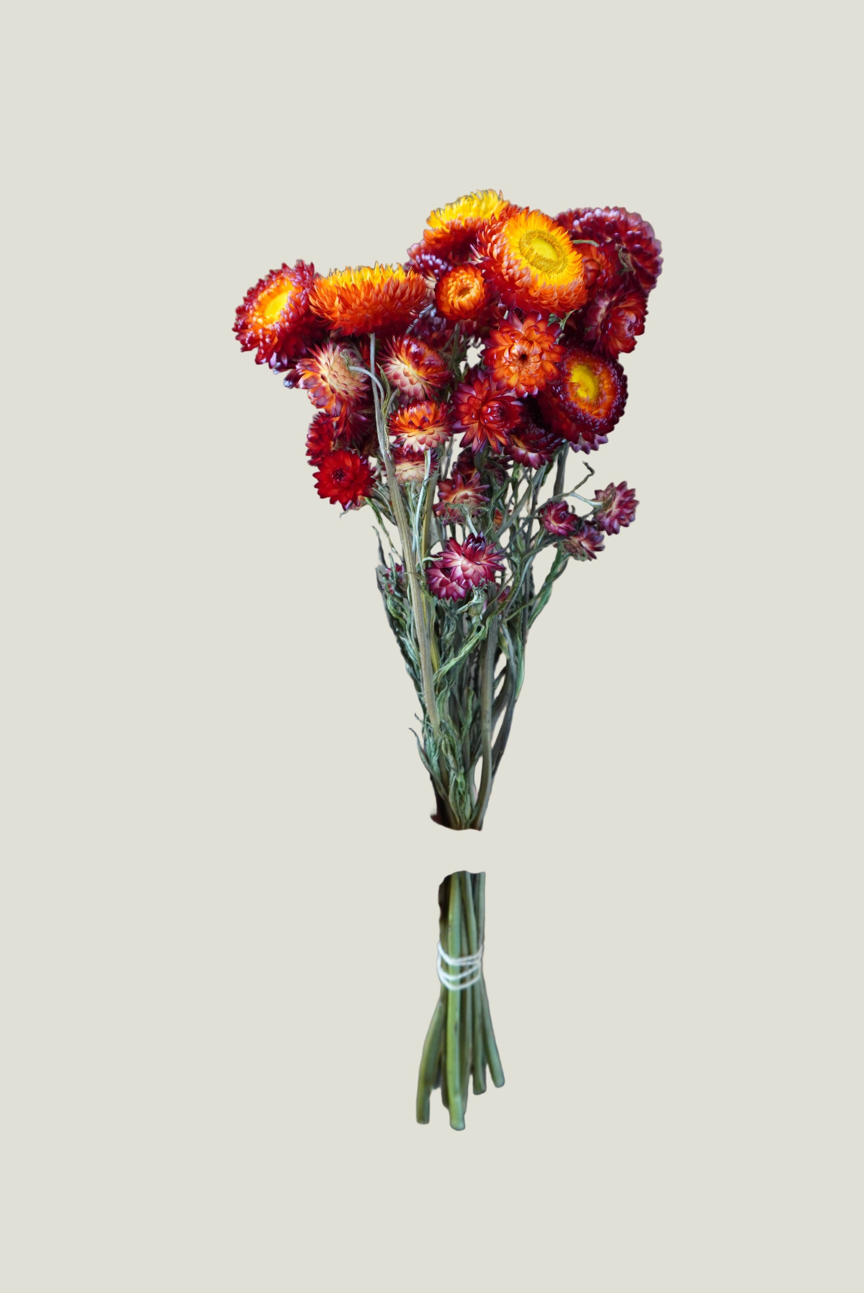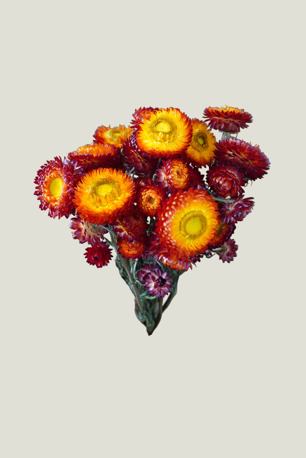 These strawflowers were organically and sustainably grown on a farm and naturally hang dried without the use of any chemicals or dyes. They are beautiful enough to stand alone in a vase, hung up on the wall, or used for crafting. Bunches consist of 10-15 stems with blooms ranging from 0.5" to 2". The length of the stems are between 12"-16". The colors and size of flowers may vary. Dried flowers are fragile so some minimal breaking may occur during the shipping process. Dried flowers will last several years with the proper care - keep out of water, humidity and direct sunlight for the best results. If the flowers droop due to rehydration, simply hang upside down for a couple days in a dry area to regain straight stems.