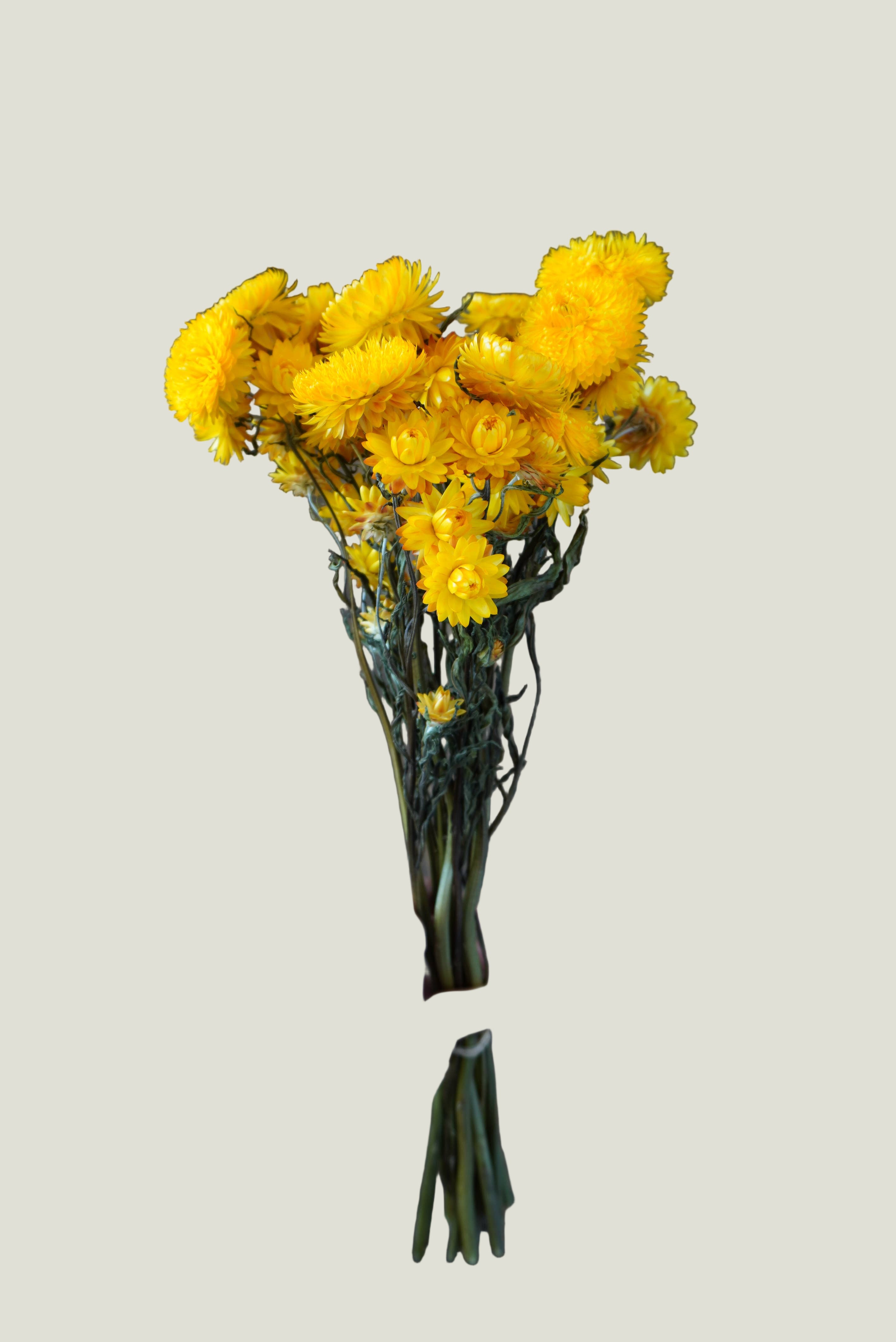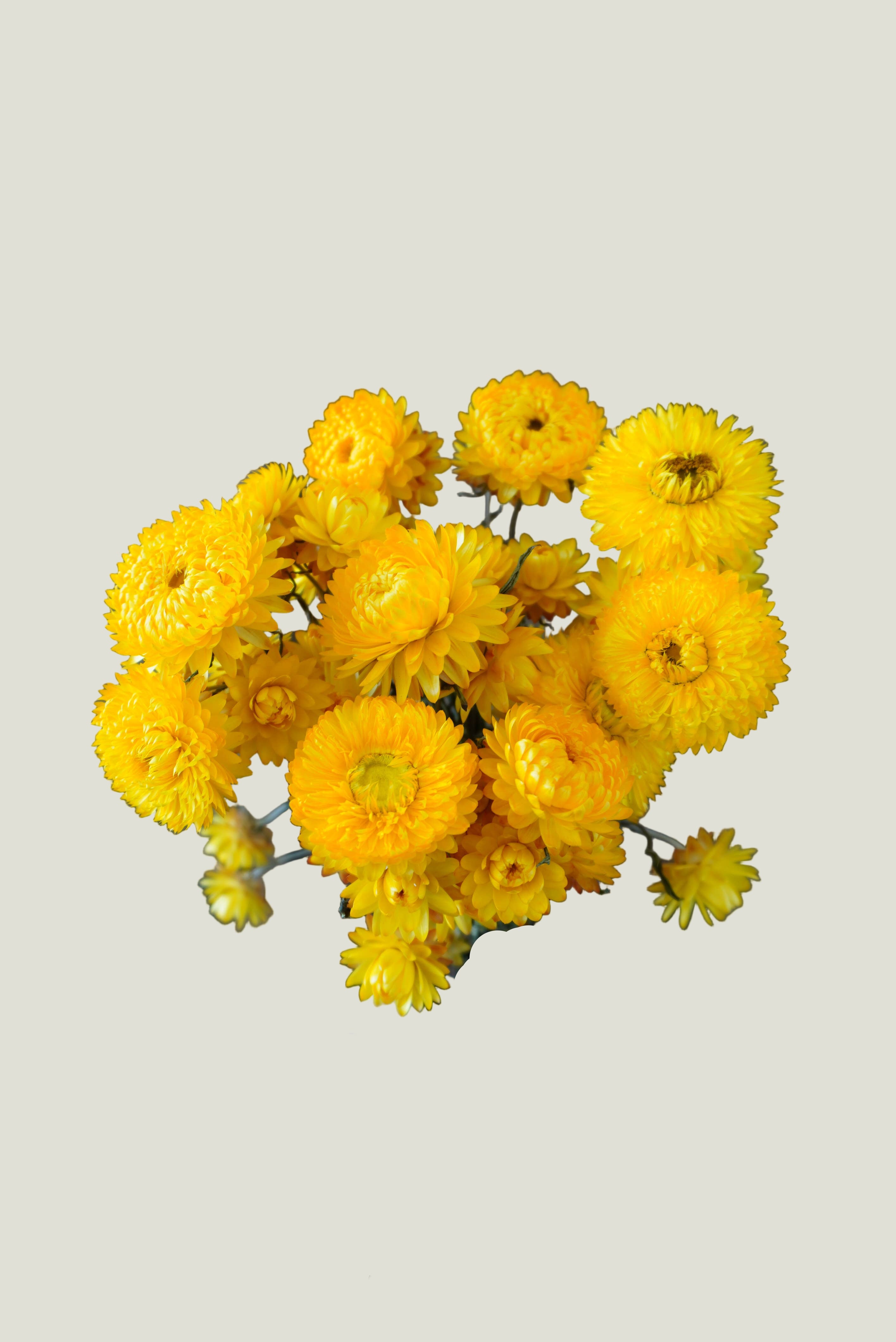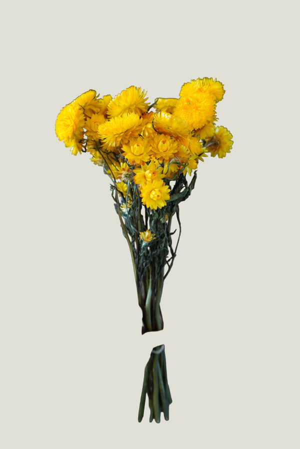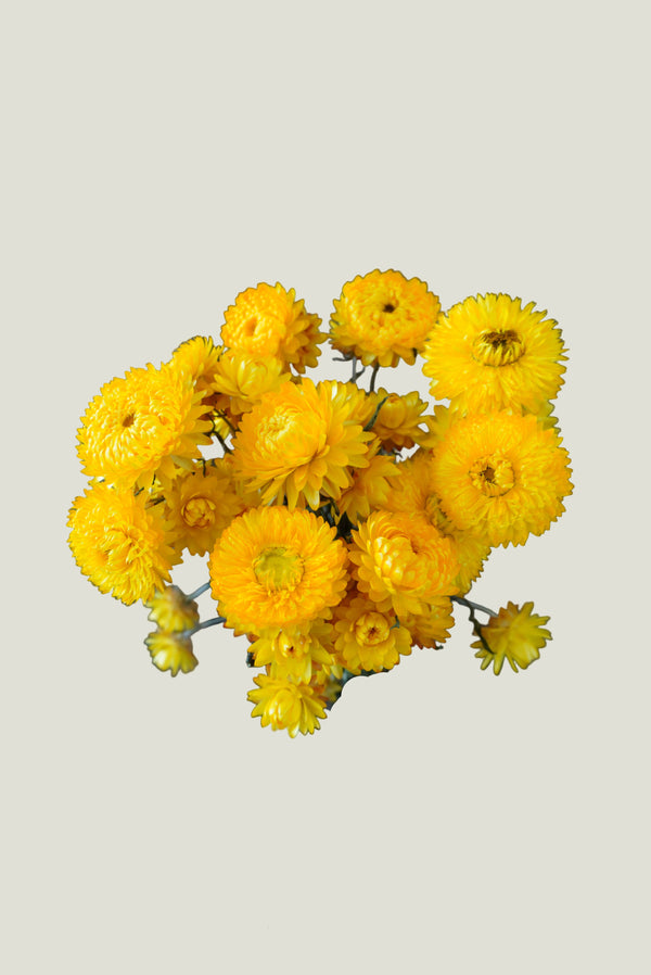 These strawflowers were organically and sustainably grown on a farm and naturally hang dried without the use of any chemicals or dyes. They are beautiful enough to stand alone in a vase, hung up on the wall, or used for crafting. Bunches consist of 10-15 stems with blooms ranging from 0.5" to 2". The length of the stems are between 12"-16". The colors and size of flowers may vary. Dried flowers are fragile so some minimal breaking may occur during the shipping process. Dried flowers will last several years with the proper care - keep out of water, humidity and direct sunlight for the best results. If the flowers droop due to rehydration, simply hang upside down for a couple days in a dry area to regain straight stems.
