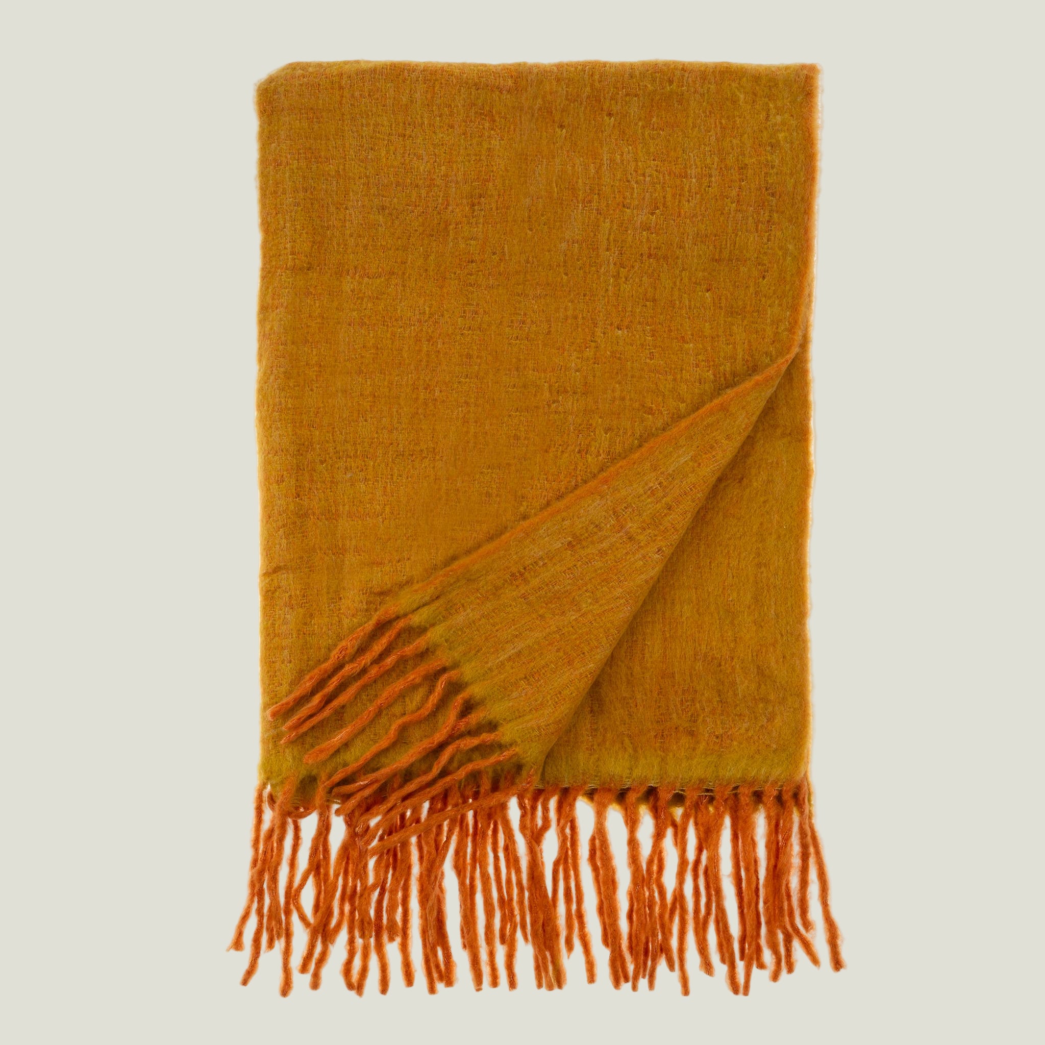 Oslow Wool Blend Throw, Turmeric: A Bold and Cozy Statement Infuse your space with warmth and vibrancy with the Oslow Wool Blend Throw in Turmeric. Featuring a striking orange hue with deeper orange fringing, this throw adds an energetic and inviting touch to any setting. The soft wool blend provides cozy comfort, making it perfect for layering over sofas, beds, or wrapping around yourself on cooler evenings. Whether styled for seasonal warmth or year-round vibrancy, this throw brings a bold and beautiful accent to your home.